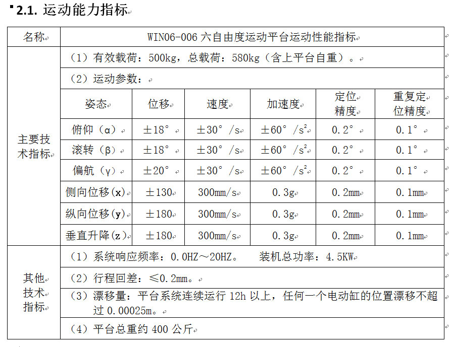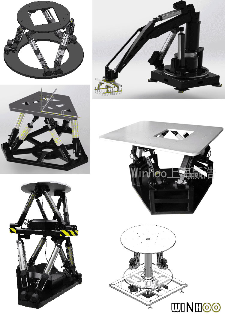 我公司接受兩自由度平臺,三自由度平臺、四自由度平臺、六自由度平臺、或在以上平臺基礎之上疊加橫向大位移,平面旋轉等姿態(tài)平臺的定制。