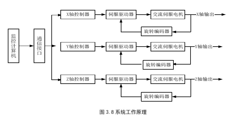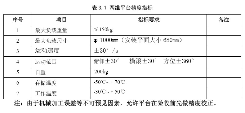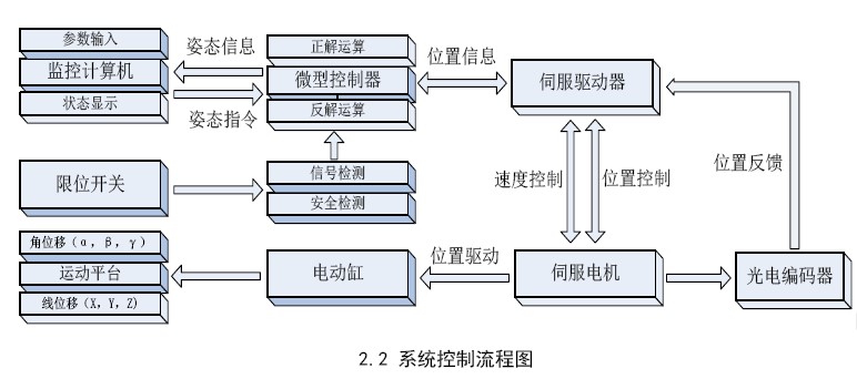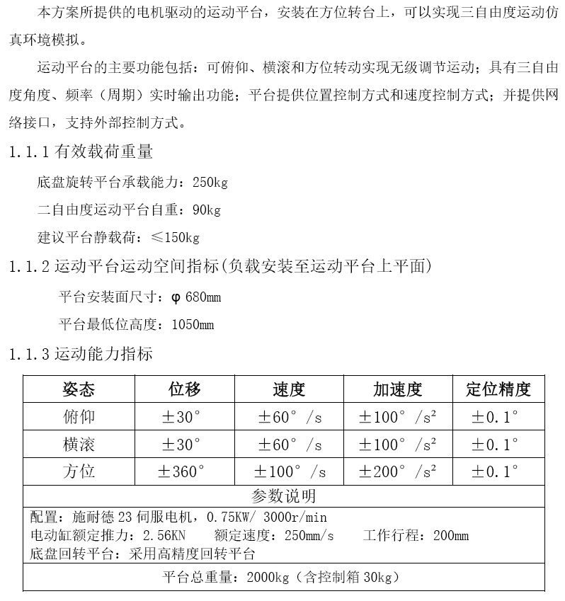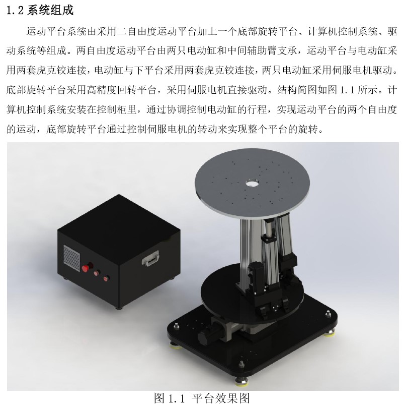 技術(shù)資料【三自由度旋轉(zhuǎn)平臺(tái)】 采用【兩自由度運(yùn)動(dòng)平臺(tái)】 ,底部【旋轉(zhuǎn)平臺(tái)】機(jī)械結(jié)構(gòu)、 【計(jì)算機(jī)控制系統(tǒng)】、【驅(qū)動(dòng)系統(tǒng)】等組成。【兩自由度運(yùn)動(dòng)平臺(tái)】由兩只【電動(dòng)缸】和中間輔助臂支承,運(yùn)動(dòng)平臺(tái)與電動(dòng)缸采用兩套虎克鉸連接,電動(dòng)缸與下平臺(tái)采用兩套虎克鉸連接,兩只電動(dòng)缸采用伺服電機(jī)驅(qū)動(dòng)。底部旋轉(zhuǎn)平臺(tái)采用高精度回轉(zhuǎn)平臺(tái),用伺服電機(jī)直接驅(qū)動(dòng)??刂葡到y(tǒng)安裝在控制柜里,通過UDP網(wǎng)絡(luò)協(xié)議與上位計(jì)算機(jī)通信,通過協(xié)調(diào)控制電動(dòng)缸的行程,實(shí)現(xiàn)運(yùn)動(dòng)平臺(tái)的兩個(gè)自由度的運(yùn)動(dòng),底部旋轉(zhuǎn)平臺(tái)通過控制伺服電機(jī)的轉(zhuǎn)動(dòng)來實(shí)現(xiàn)整個(gè)平臺(tái)的旋轉(zhuǎn)。